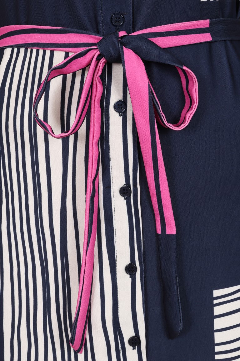 A contemporary shirt dress featuring a bold mix of vertical and horizontal stripes, full button-down front, and a matching tie belt for a flattering fit. Available in two striking colourways – black with olive accents or navy with pink highlights – this versatile midi is perfect for both casual and elevated looks.