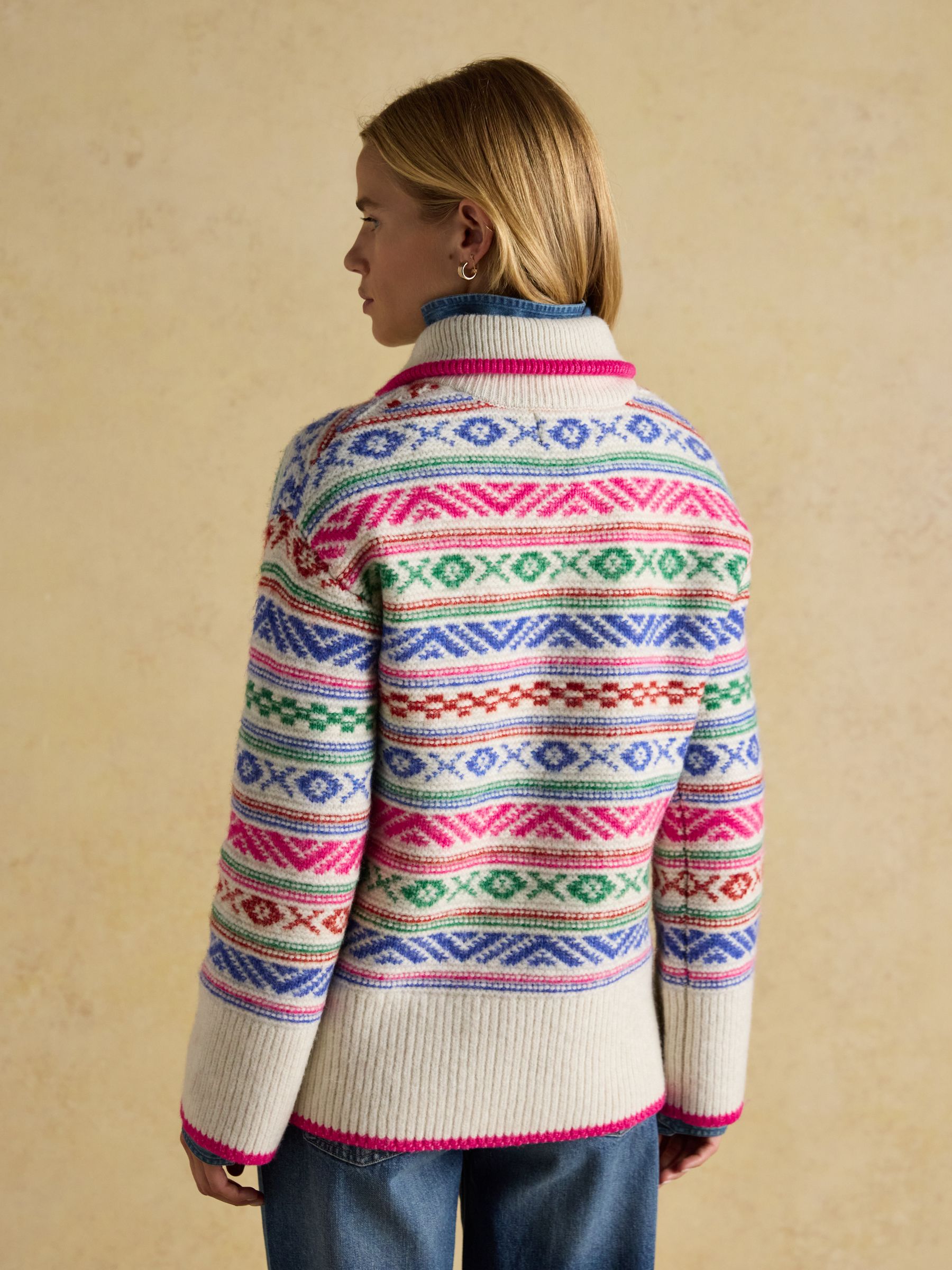 The Allaway is a piece bursting with personality and intricate detailing. It’s designed with a warm funnel neck and a handy quarter zip fastening that can be worn open for a wider look or closed to keep out the chill. Its vibrant Fair Isle design tells an artful story and it’s finished with contrasting ribbed trims that add to its appeal. – Funnel neck – Quarter zip fastening – Long sleeves – Fair Isle design – Contrasting ribbed trims – Dropped shoulders