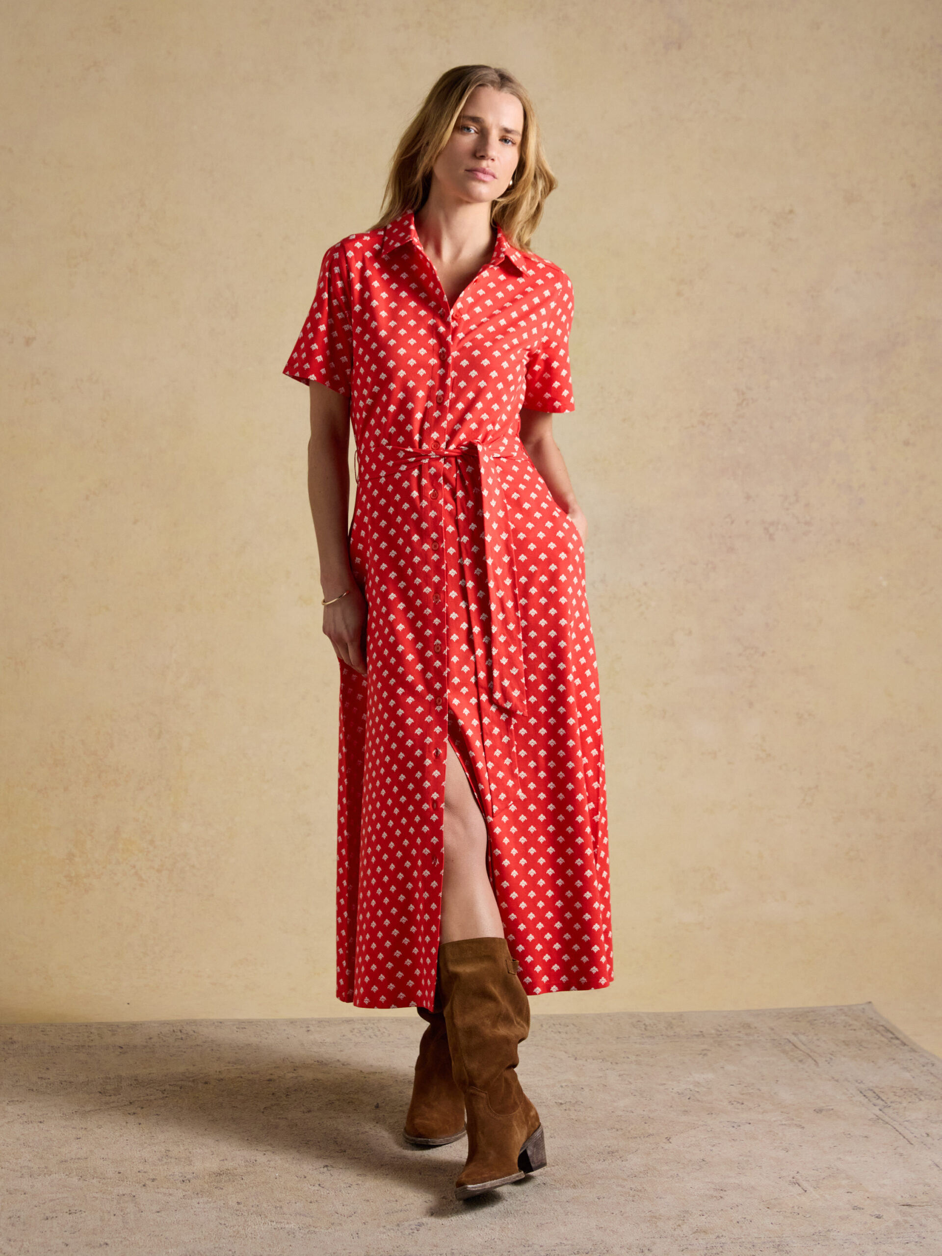 The Sabrina shirt dress will be an effortless and dreamy addition to your seasonal wardrobe. Cotton-rich and crafted to perfection, it’s cut to a midi length with buttons through the centre, has handy side pockets, and can be cinched with a tie waistband to frame your profile in all the right ways. Its pattern is hand drawn in house by our super talented print team and will easily match with your favourite sandals on a summers day.