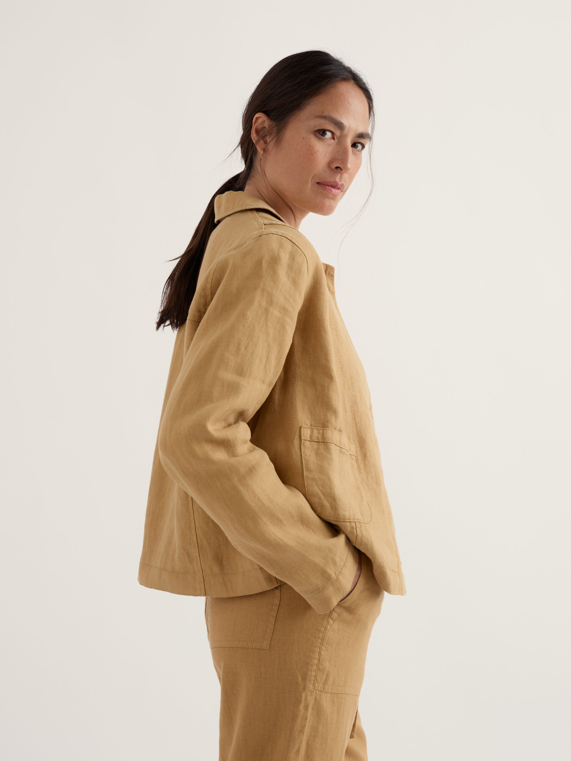 A classic garment-dyed linen jacket with an easy, relaxed structure that’s influenced by Cornish workwear. Throw over jumpers and jeans, or wear loose over flowing dresses. Our linen will grow softer and smoother with each summer of wear, developing a characterful pattern of highs and lows that is completely unique.