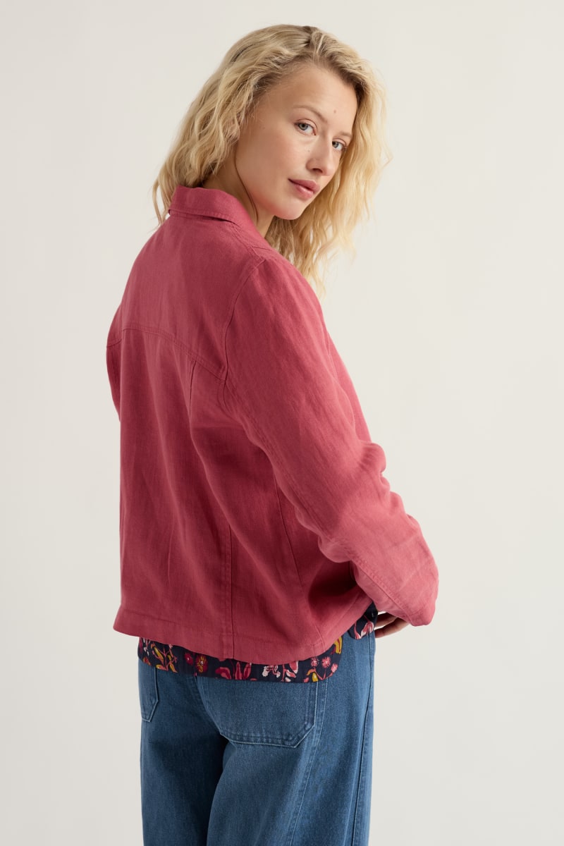 A classic garment-dyed linen jacket with an easy, relaxed structure that’s influenced by Cornish workwear. Throw over jumpers and jeans, or wear loose over flowing dresses. Our linen will grow softer and smoother with each summer of wear, developing a characterful pattern of highs and lows that is completely unique.