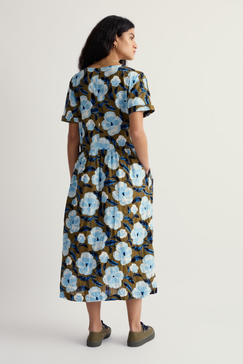A loose-fit dress with a dropped waistline, in soft organic cotton. We’ve given it side seam pockets and gathers to the skirt that lend the style a beautiful swish. It’s perfect paired with crisp white trainers or heeled leather boots.
