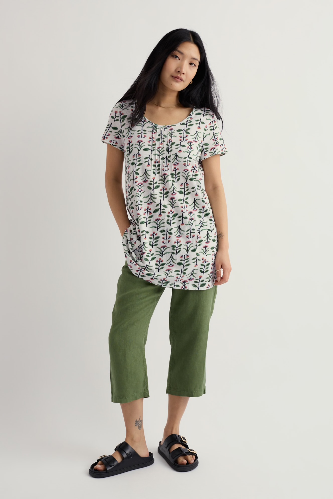 A short-sleeved tunic, in soft organic cotton slub jersey. Our Busy Lizzy Tunic has a flattering scoop neck, pintuck detailing on the front and two patch pockets. A shorter length tunic which looks great layered over crops with a pair of colourful leather sandals.