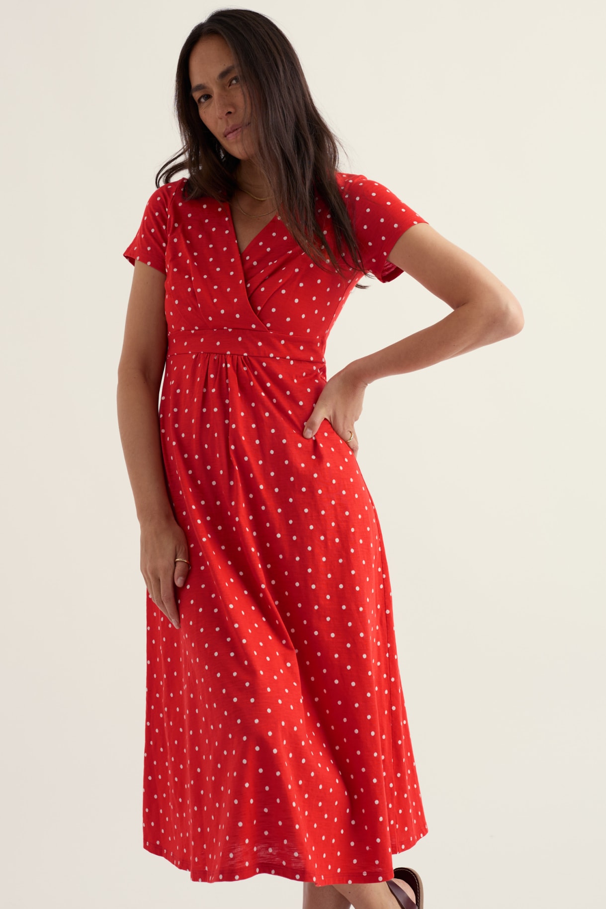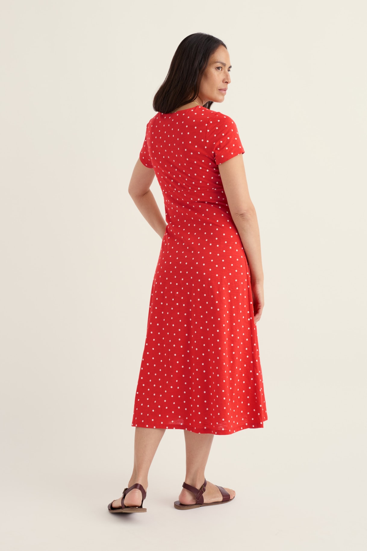 A versatile, elegant midi dress in soft, easy organic cotton jersey. Our Chapelle Dress has short sleeves and a wrap-style V-neck with gentle gathers under the bust and a skimming, drapey skirt. In a unique Seasalt print, this easy-to-wear style is sure to become a wardrobe favourite.
