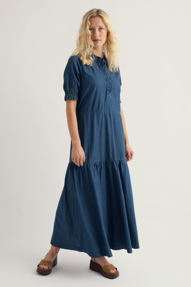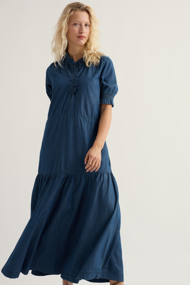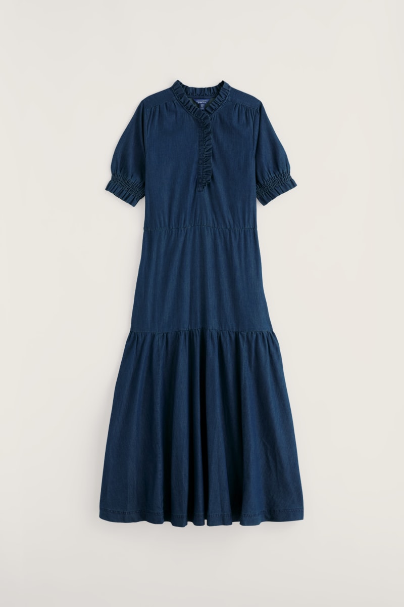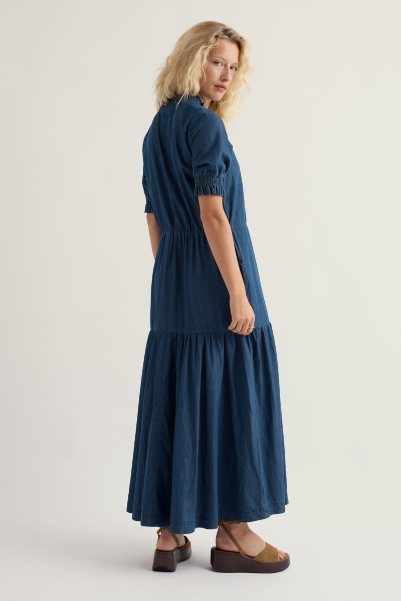 Crafted from a textured blend of organic cotton and LENZING™ ECOVERO™ viscose, our Feather Star Dress has a tonal self-check. It’s been carefully designed, boasting gentle gathers through the tiered skirt and soft frills along the button-down half placket and the smocked cuffs. Complete with blouson sleeves, hidden pockets and a soft elasticated waist.