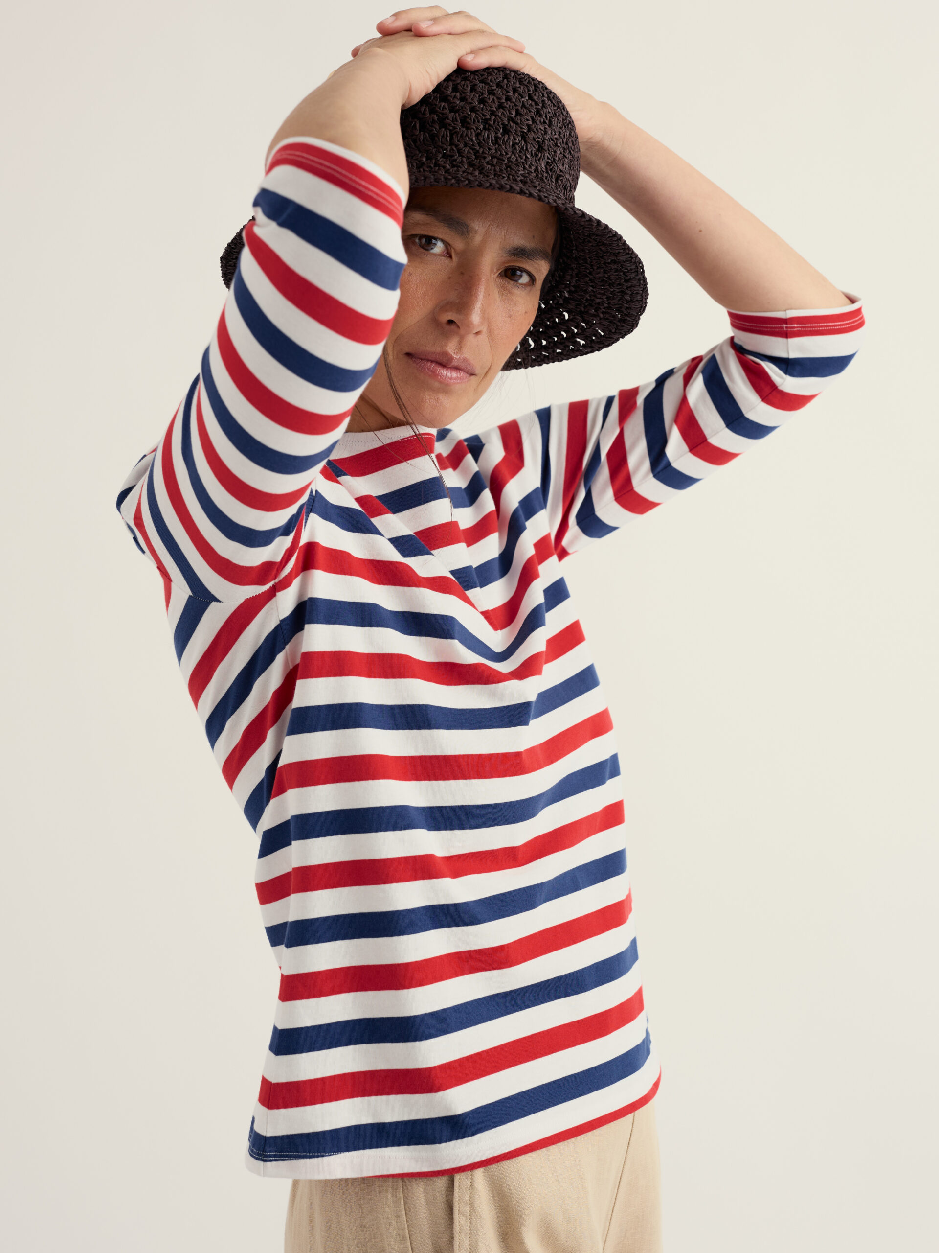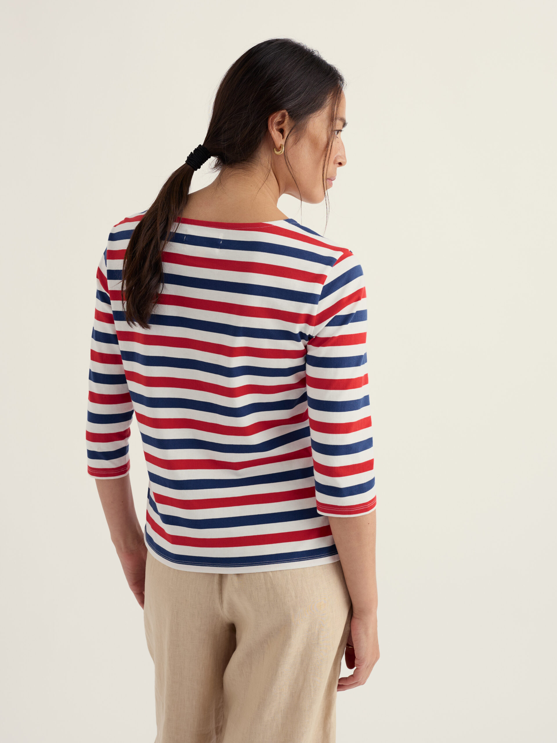 A 3/4 sleeve version of our classic sailor stripes, made with soft and breathable organic cotton, with an elegant boat neck and relaxed fit. The stripes come in a range of coastal colours, and are yarn-dyed for crisp vibrancy. Choose from a range of designs including slim Bretons and Falmouth stripes with a plain yoke. Effortless style perfect for layering. GOTS represents the gold standard of organic cotton, which is grown without harmful fertilisers and pesticides, protecting wildlife, soil quality and people.