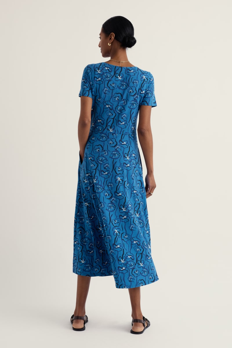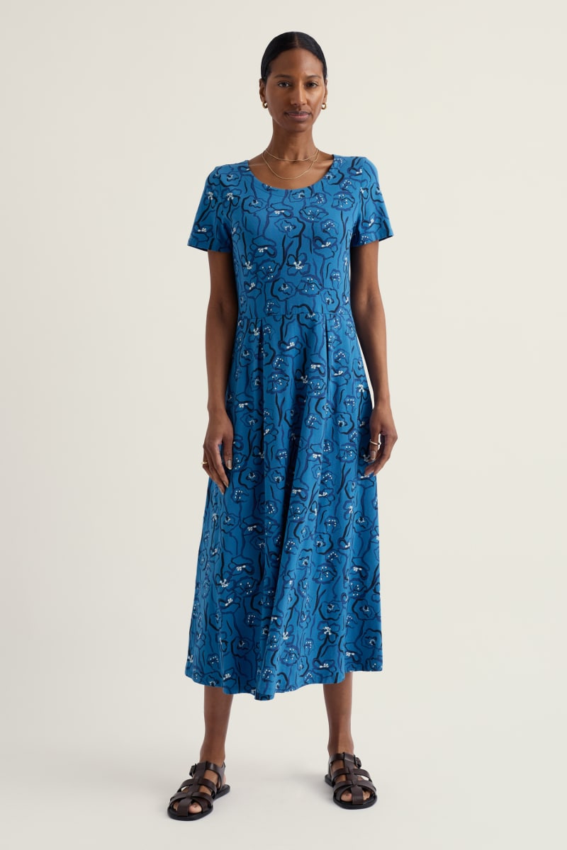 A half-sleeve version of our favourite Veronica Dress, with the same versatile midi length and drapey pleated skirt. The easy shape and organic cotton blend jersey give a lovely movement to our handcrafted prints. We’ll be wearing it with simple trainers and sandals all summer long.