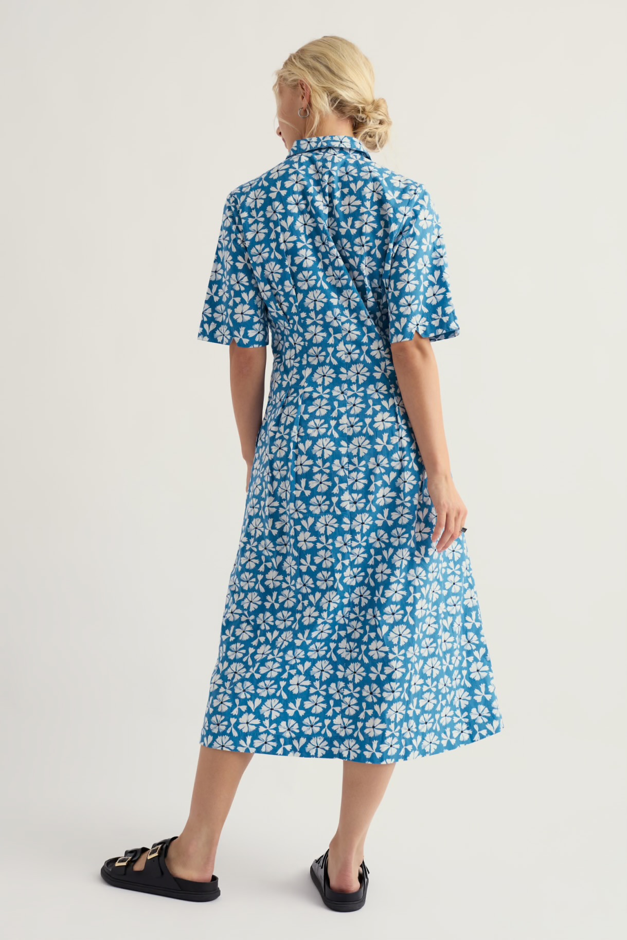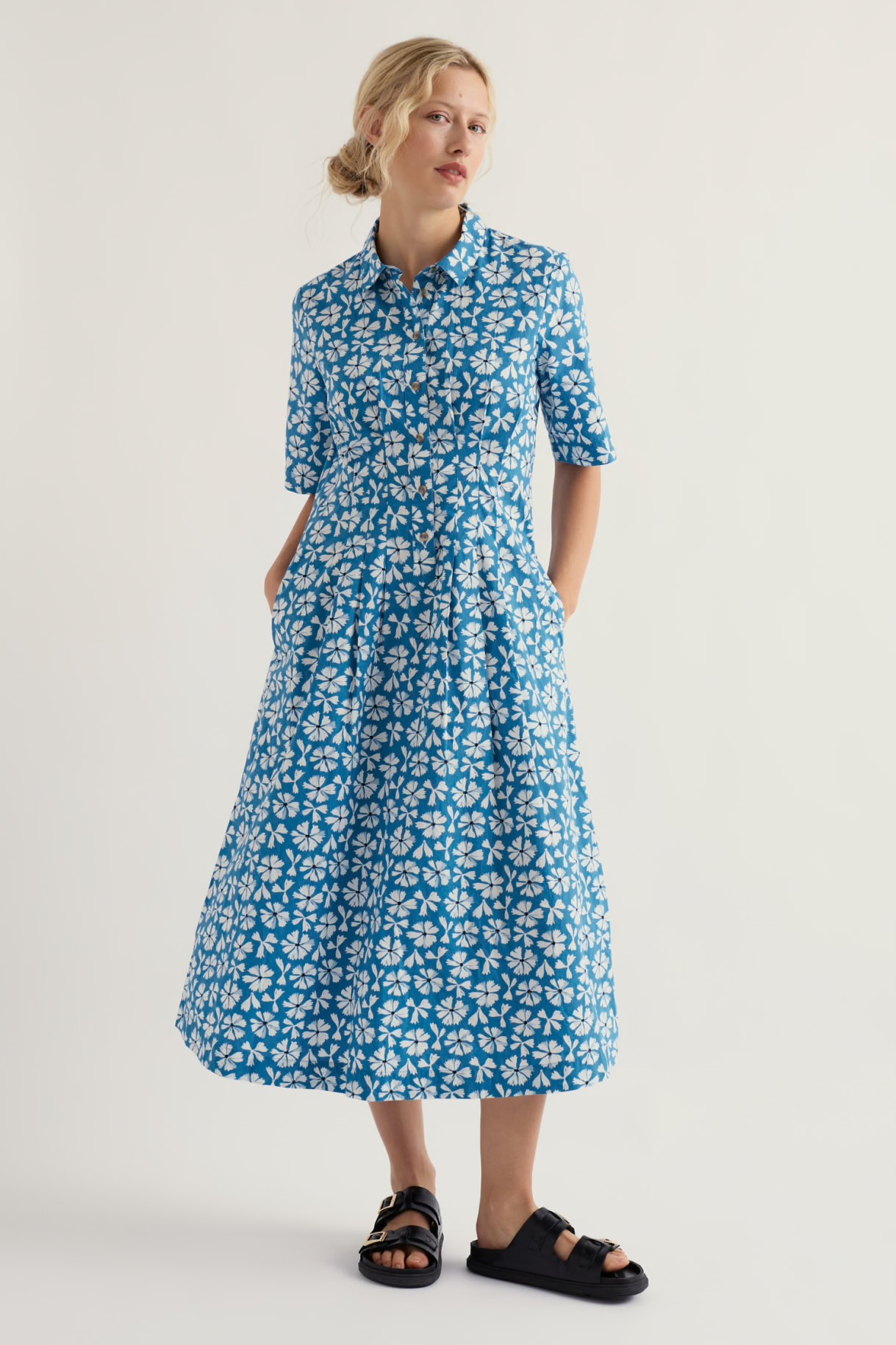 Clever tailoring touches like darts and inverted pleats give the Wild Liquorice Dress a flattering waisted shape. The shirt-style bodice, complete with collar and buttoned placket, flares out into a full, midi-length skirt. Made from GOTS-certified organic cotton, the dress is comfortable and easy to wear.